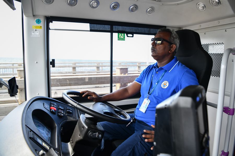 A driver steers a bus on the China-Maldives Friendship Bridge in Maldives, Sept. 1, 2019. (Photo by Du Cailiang/Xinhua)