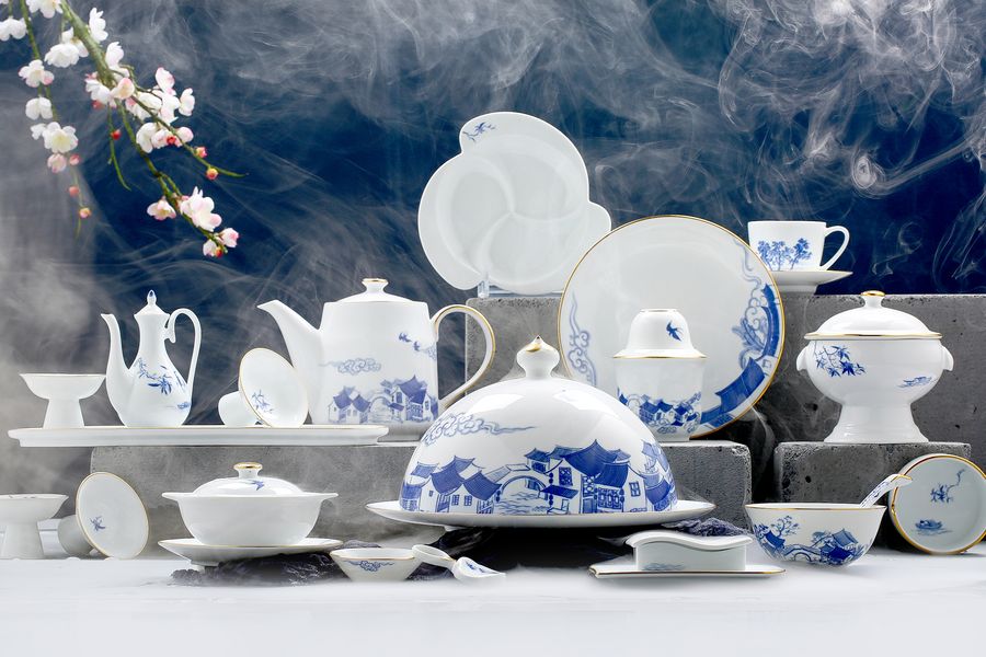 Photo shows a set of ceramic tableware made in Jingdezhen, east China's Jiangxi Province.(Xinhua)