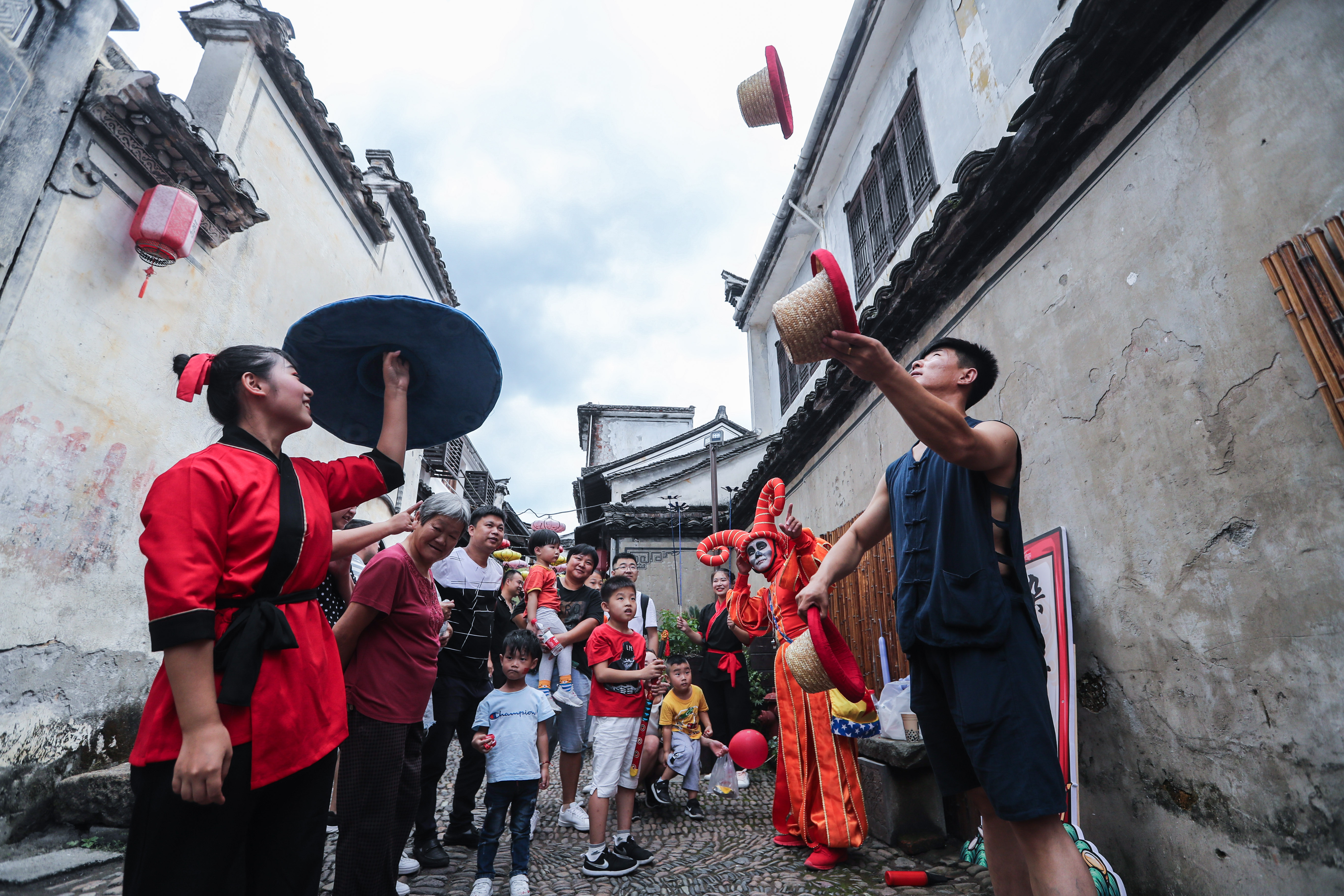 Visitors watch performance at the Longmen ancient town at Fuyang District in Hangzhou, east China's Zhejiang Province, Oct. 2, 2019, the second day of the 7-day-long National Day holiday. (Xinhua/Xu Yu)