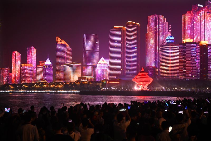 People watch a light show marking the 70th founding anniversary of the People's Republic of China (PRC) at the Fushan Bay in Qingdao, east China's Shandong Province, Oct. 1, 2019. (Xinhua/Li Ziheng)