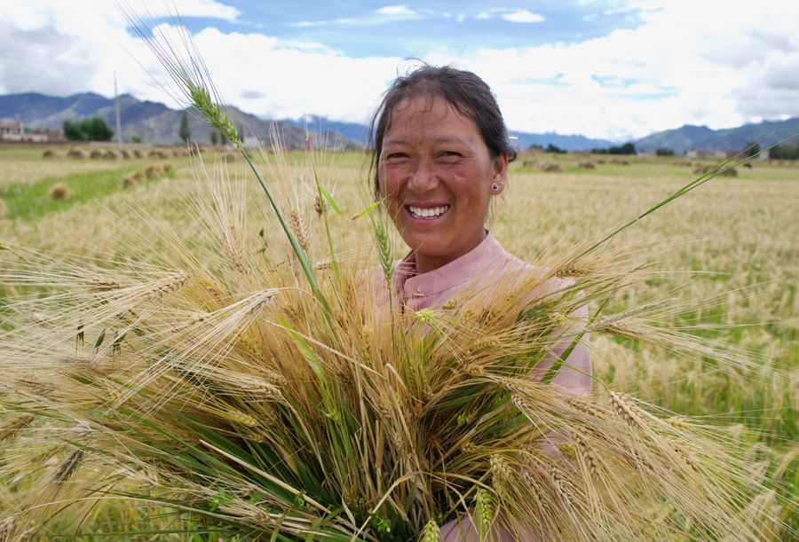 A farmer harvests highland barley in the fields at Kaduo Village in Linzhou County, southwest China's Tibet Autonomous Region, Sept. 3, 2018. (Xinhua/Purbu Zhaxi)