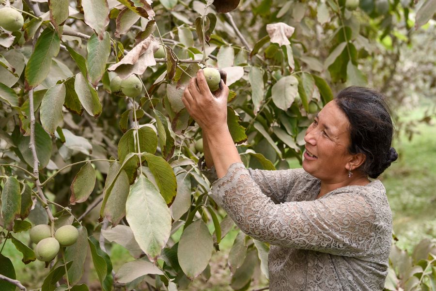 A farmer picks walnuts in Hotan County, northwest China's Xinjiang Uygur Autonomous Region, Sept. 6, 2019. (Xinhua/Ding Lei)