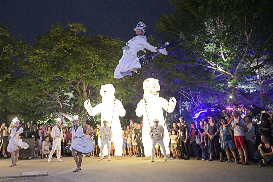Performers from France perform "The Bear's Mouth" at the annual French festival "Voila!" held in Gardens by the Bay in Singapore, Oct. 19, 2019. (Xinhua/Then Chih Wey)