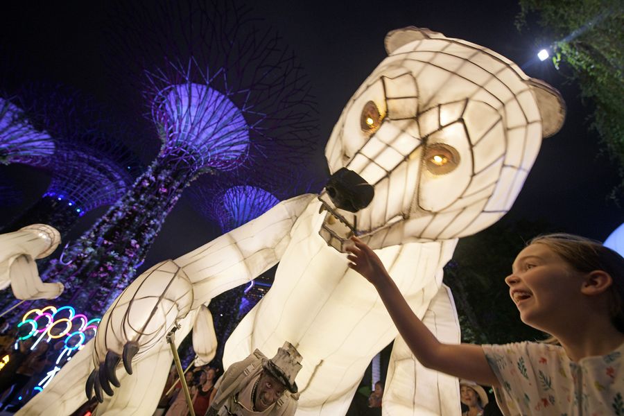 SINGAPORE, Oct. 19, 2019 (Xinhua) -- Performers from France perform "The Bear's Mouth" at the annual French festival "Voila!" held in Gardens by the Bay in Singapore, Oct. 19, 2019. "The Bear's Mouth" is an outdoor performance comprising of four meter tall illuminated bears, ballets dancers and stilt walkers holding a parade with close proximity interaction with the public audience.