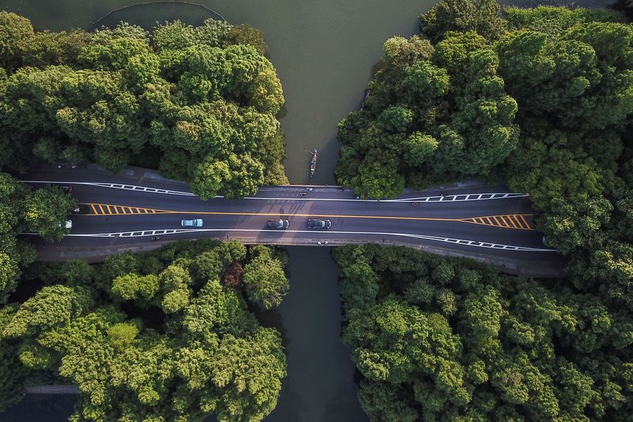 Aerial photo taken on May 24, 2019 shows vehicles on the Yanggongdi causeway in the West Lake scenic area in Hangzhou, capital of Zhejiang Province. (Xinhua/Huang Zongzhi)