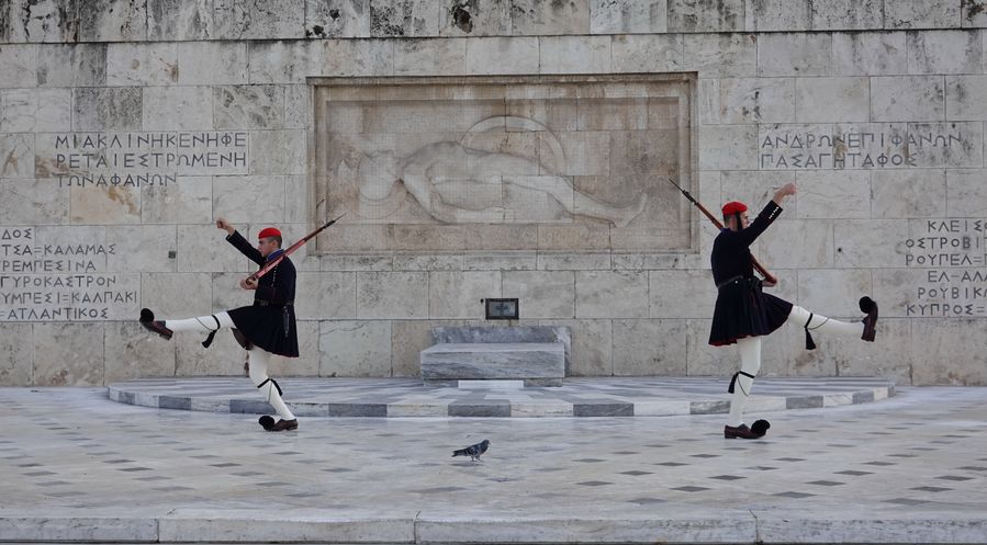 Guards perform the changing of the guard ceremony on Syntagma Square in Athens, Greece, Nov. 7, 2019. (Xinhua/Lai Xiangdong)