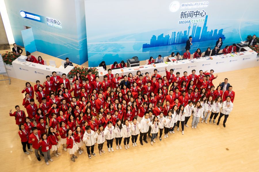 Volunteers pose for a group photo at the media center of the second China International Import Expo (CIIE) in Shanghai, east China, Nov. 4, 2019. Over 6,300 volunteers are serving in various capacities at the second China International Import Expo (CIIE), 20 percent of whom also served at the first CIIE last year. (Xinhua/Zhang Xiaoyu)