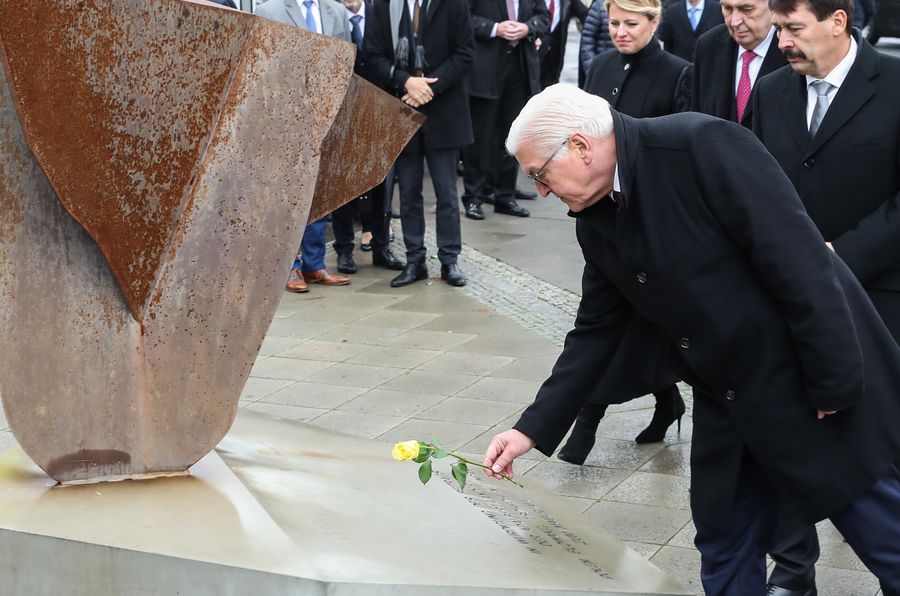 German President Frank-Walter Steinmeier (Front) lays a flower during a commemoration to mark the 30th anniversary of the fall of the Berlin Wall in Berlin, capital of Germany, on Nov. 9, 2019. Germany marked the 30th anniversary of the fall of the Berlin Wall on Saturday. (Xinhua/Shan Yuqi)