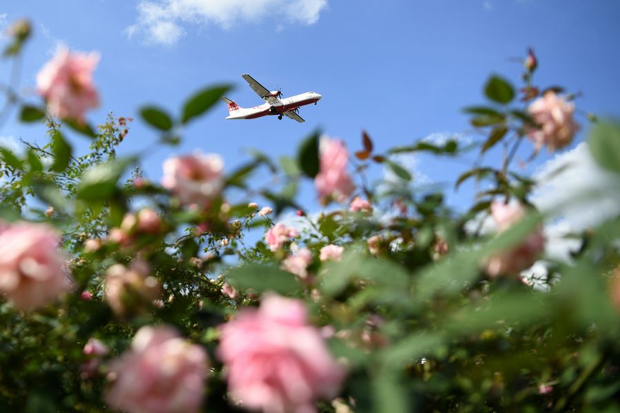 A plane flies over roses displayed at Taipei Expo Park in Taipei, southeast China's Taiwan, Nov. 9, 2019. The rose show, with nearly 3,000 roses of different varieties, opened here on Saturday. (Xinhua/Chen Bin)