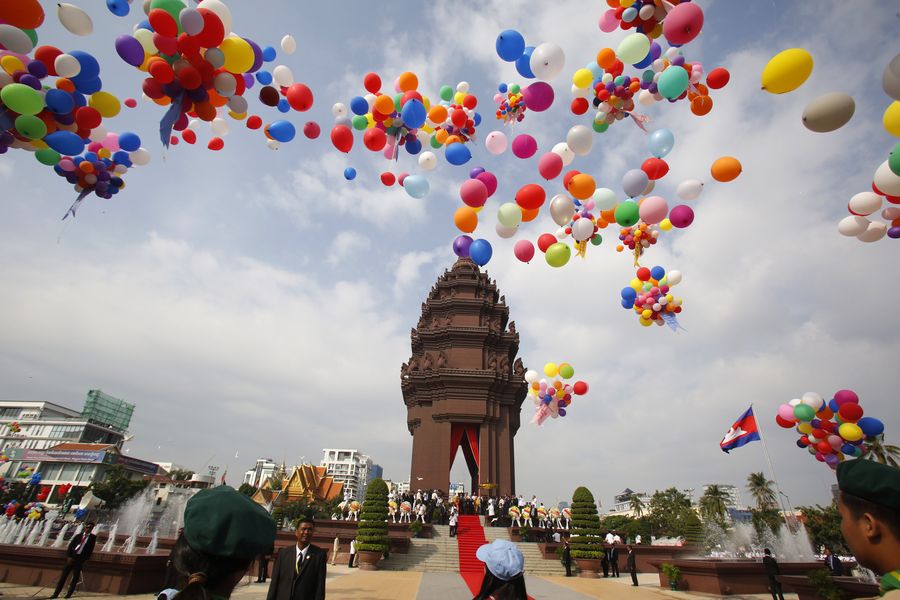 Balloons are released during the Independence Day celebration in Phnom Penh, Cambodia, Nov. 9, 2019. Cambodia commemorated the 66th anniversary of independence from the French colonial rule on Saturday. (Photo by Sovannara/Xinhua)