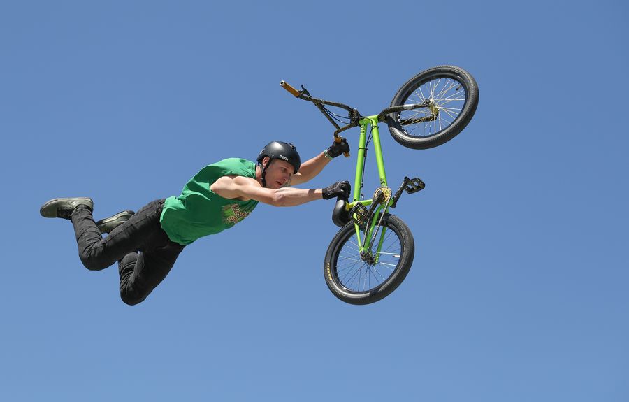 A stunt rider performs during Sydney's Big Adventure at Sydney Park in Sydney, Australia, Nov. 9, 2019. (Xinhua/Bai Xuefei)