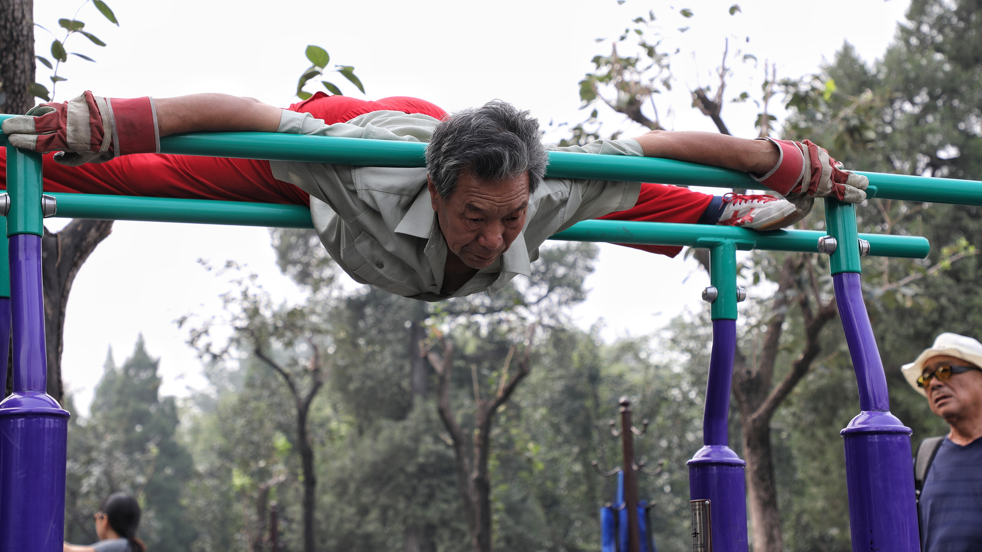 A group of athletic silver-haired men turn the centuries-old Temple of Heaven in Beijing into a vibrant world when they stand on head, swing around the high bar or practice Taiji.