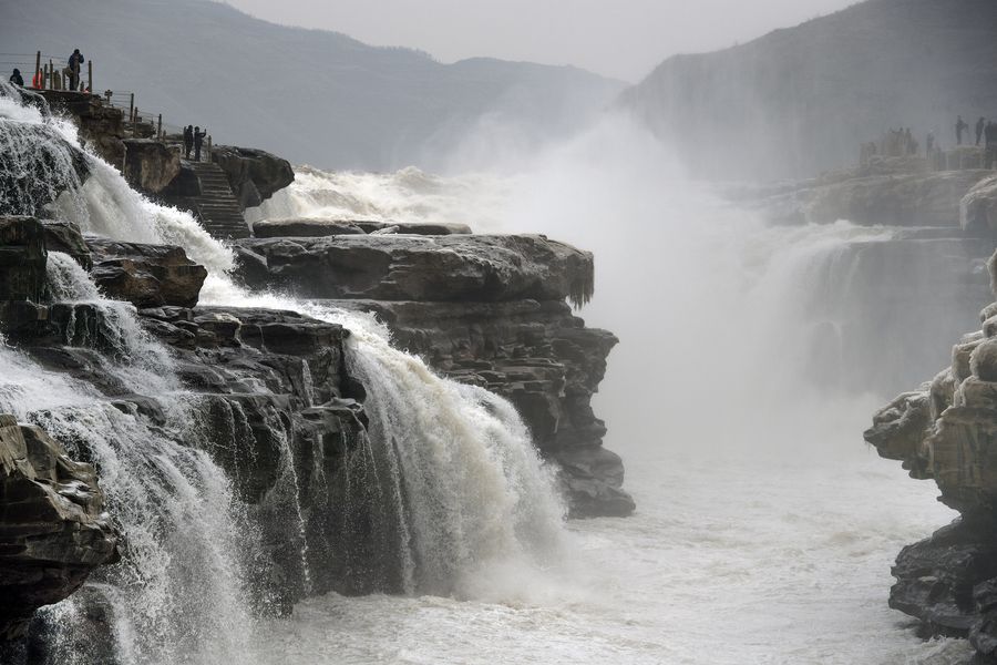 Tourists visit the Hukou Waterfall scenic spot, Dec. 14, 2019. (Xinhua/Tao Ming)