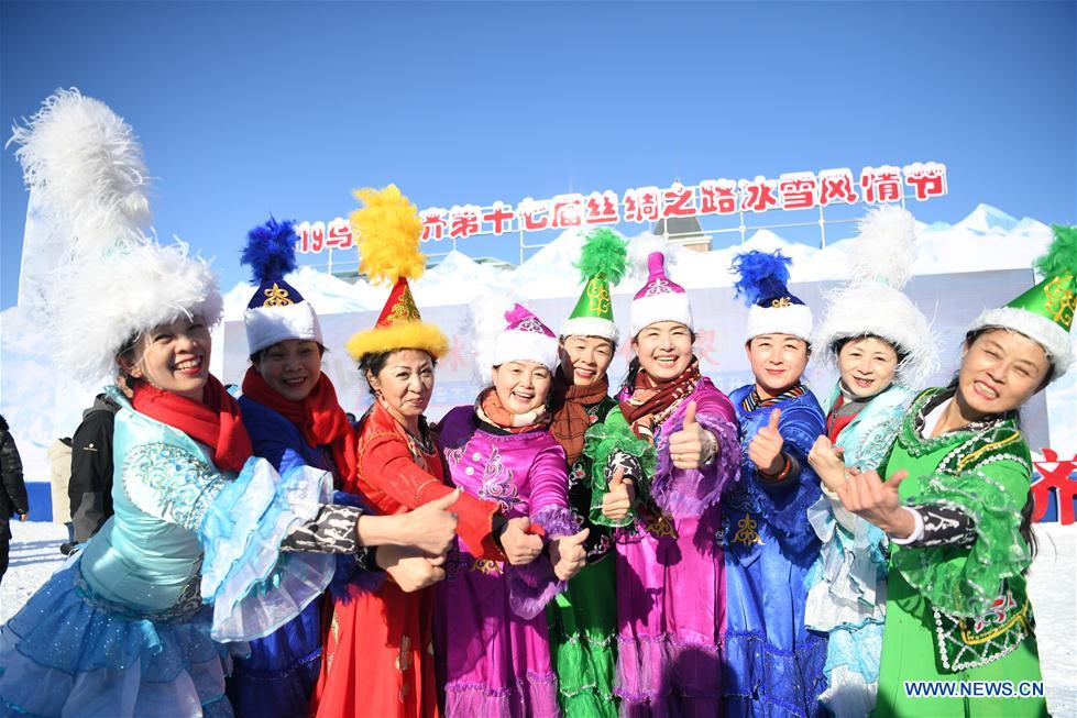 Performers in traditional costumes pose for photos during the opening ceremony of the Urumqi Silk Road Ice & Snow Festival in Urumqi, northwest China's Xinjiang Uygur Autonomous Region, Dec. 23, 2019. The 17th Urumqi Silk Road Ice & Snow Festival opened Monday in Urumqi, and will last till April of 2020. (Xinhua/Sadat)
