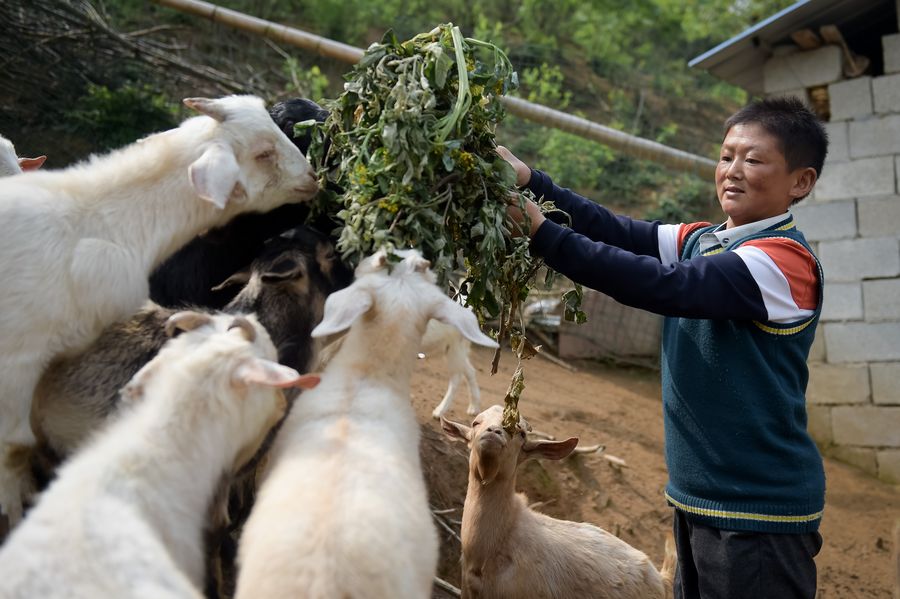Zhang Chuanfeng feeds his lambs in Zhufan Village of Jinzhai County, east China's Anhui Province, April 26, 2017. (Xinhua/Zhang Duan)