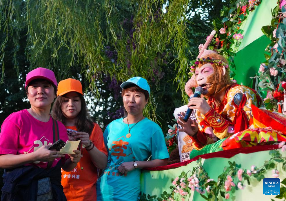 Wang Qingfeng acting as the "Xuebing Monkey", or rice-cracker monkey, interacts with tourists at the Changchun Zoological and Botanical Park in Changchun, northeast China's Jilin Province, Sept. 18, 2025. (Xinhua)
