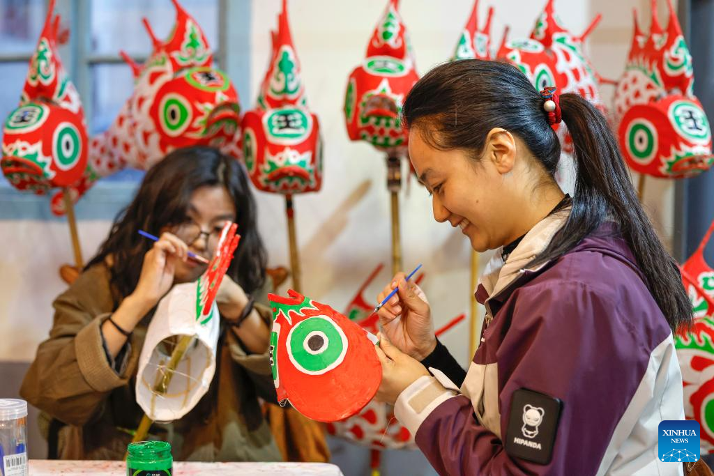 Tourists learn to make fish-shaped lanterns in Wangmantian Village, Shexian County of Huangshan City, east China's Anhui Province, March 1, 2026. (Photo by Shi Yalei/Xinhua)