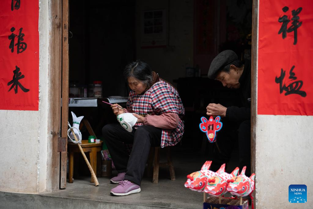 Villagers make fish-shaped lanterns in Zhanqi Village, Shexian County of Huangshan City, east China's Anhui Province, March 1, 2026. (Xinhua/Zhang Duan)