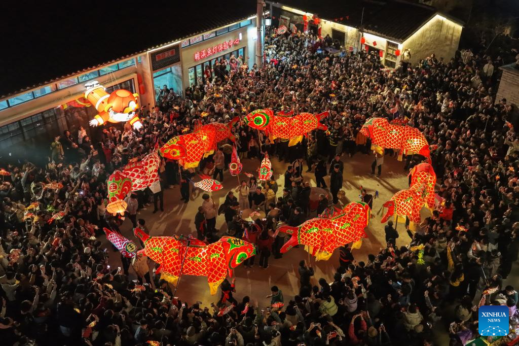 People watch a fish-shaped lanterns performance in Shexian County, Huangshan City of east China's Anhui Province, Feb. 4, 2026. (Photo by Shi Yalei/Xinhua)