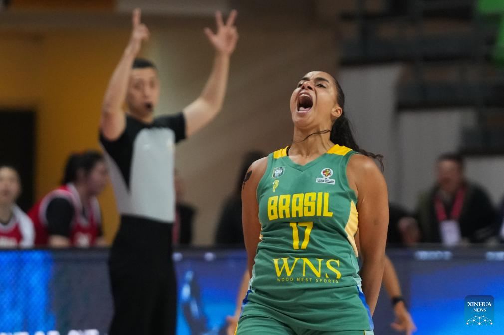 Carina dos Santos Martins of Brazil celebrates during a warm-up match between China and Brazil in Changsha, central China's Hunan Province, on March 4, 2026. (Xinhua/Chen Zhenhai)
