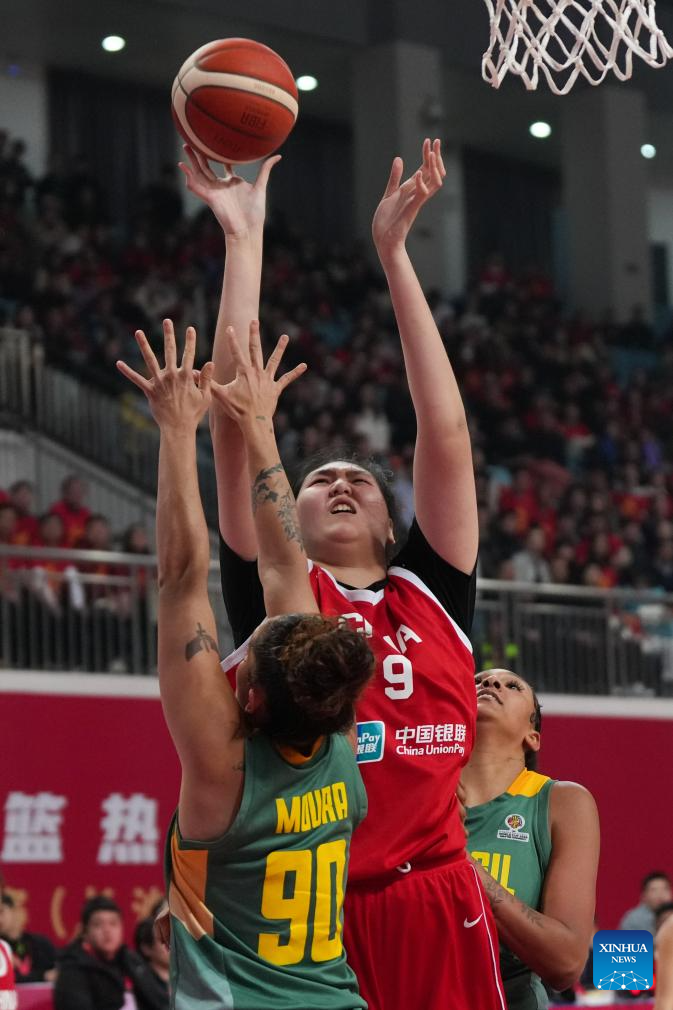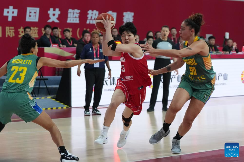 Zhang Ziyu (C) of China competes during a warm-up match between China and Brazil in Changsha, central China's Hunan Province, on March 4, 2026. (Xinhua/Chen Zhenhai)