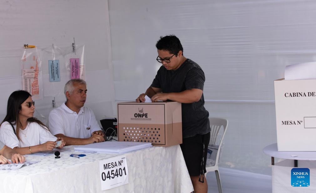 A voter casts a ballot at a polling station in Lima, Peru, April 12, 2026. Peruvian President Jose Balcazar on Sunday urged citizens to vote with "calm and serenity" as the country holds general elections to choose a new president and members of a bicameral Congress. Voters are electing a president, two vice presidents, 60 senators and 130 members of the Chamber of Deputies, marking the return to a bicameral legislature after 30 years. (Photo by Mariana Bazo/Xinhua)