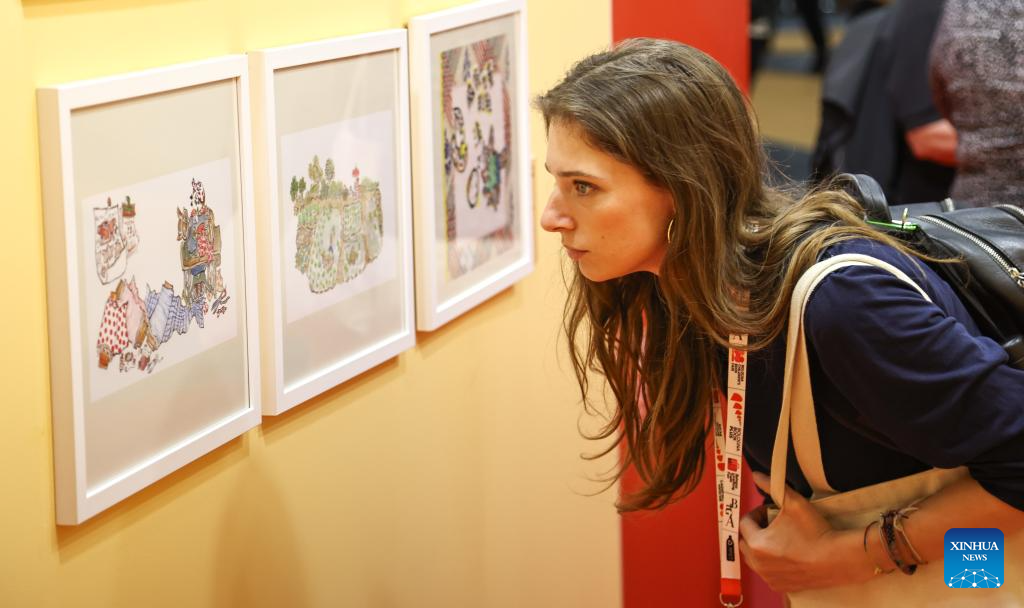 A woman visits the Chinese exhibition area during the 63rd Bologna Children's Book Fair in Bologna, Italy, April 14, 2026. The 63rd Bologna Children's Book Fair opened on Monday in the Italian city of Bologna. Chinese publishing houses have been showcasing a large number of children's books to promote Chinese literature to young readers on the global stage. (Xinhua/Wang Kaiyan)