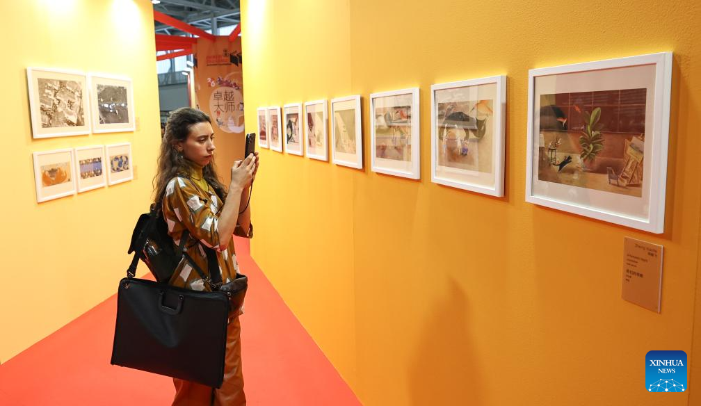 A woman takes photos at the Chinese exhibition area during the 63rd Bologna Children's Book Fair in Bologna, Italy, April 14, 2026. The 63rd Bologna Children's Book Fair opened on Monday in the Italian city of Bologna. Chinese publishing houses have been showcasing a large number of children's books to promote Chinese literature to young readers on the global stage. (Xinhua/Wang Kaiyan)