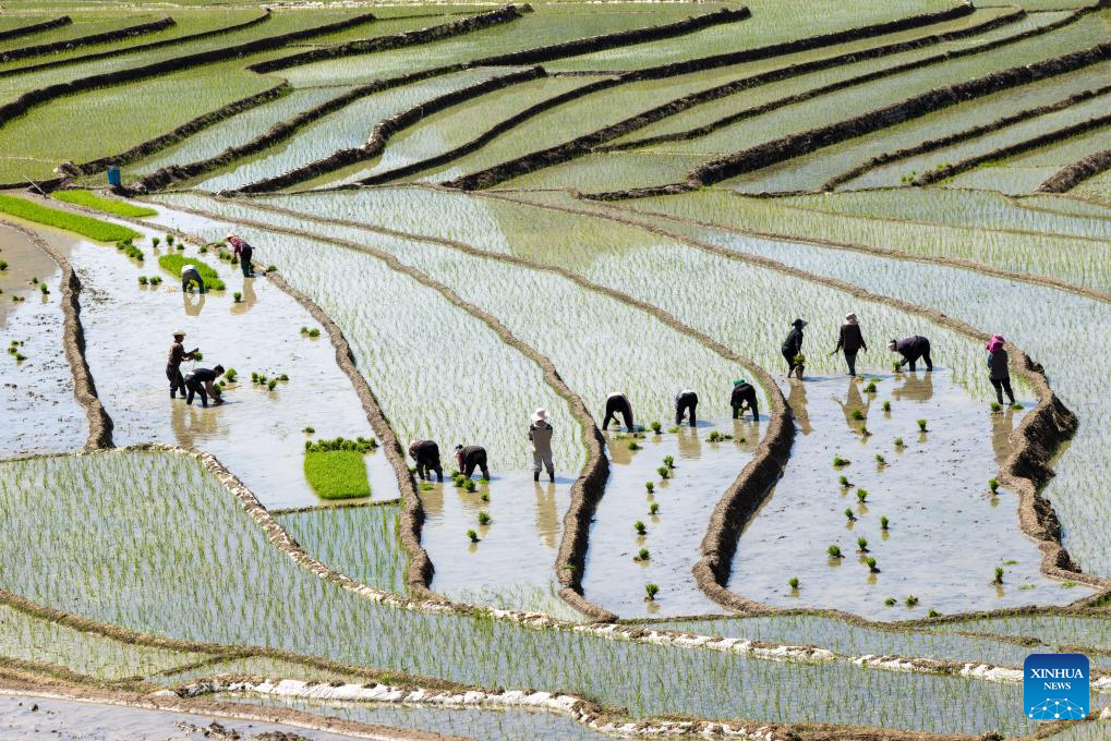 Villagers plant rice seedlings in terraced fields in Ganluo County, southwest China's Sichuan Province, April 18, 2026. (Xinhua/Jiang Hongjing)