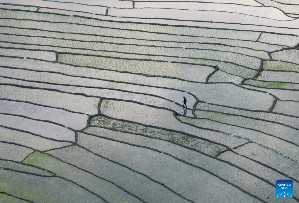 An aerial drone photo taken on April 18, 2026 shows terraced fields in Ganluo County, southwest China's Sichuan Province. (Xinhua/Jiang Hongjing)
