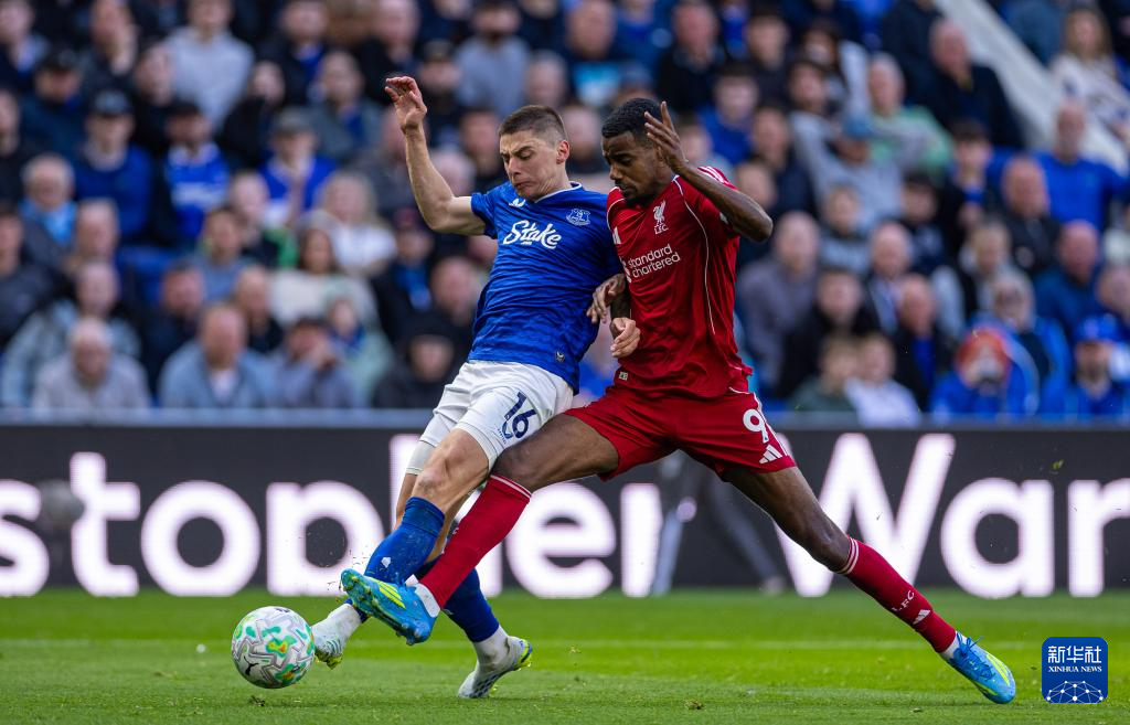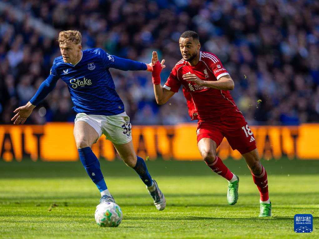Everton's Jarrad Branthwaite (L) is challenged by Liverpool's Cody Gakpo during the English Premier League match between Everton FC and Liverpool FC in Liverpool, Britain, on April 19, 2026. (Xinhua)