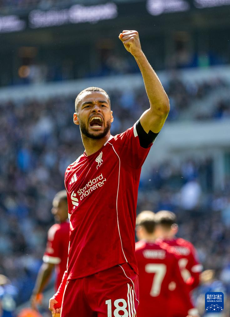 Liverpool's Cody Gakpo celebrates the team's goal during the English Premier League match between Everton FC and Liverpool FC in Liverpool, Britain, on April 19, 2026. (Xinhua)