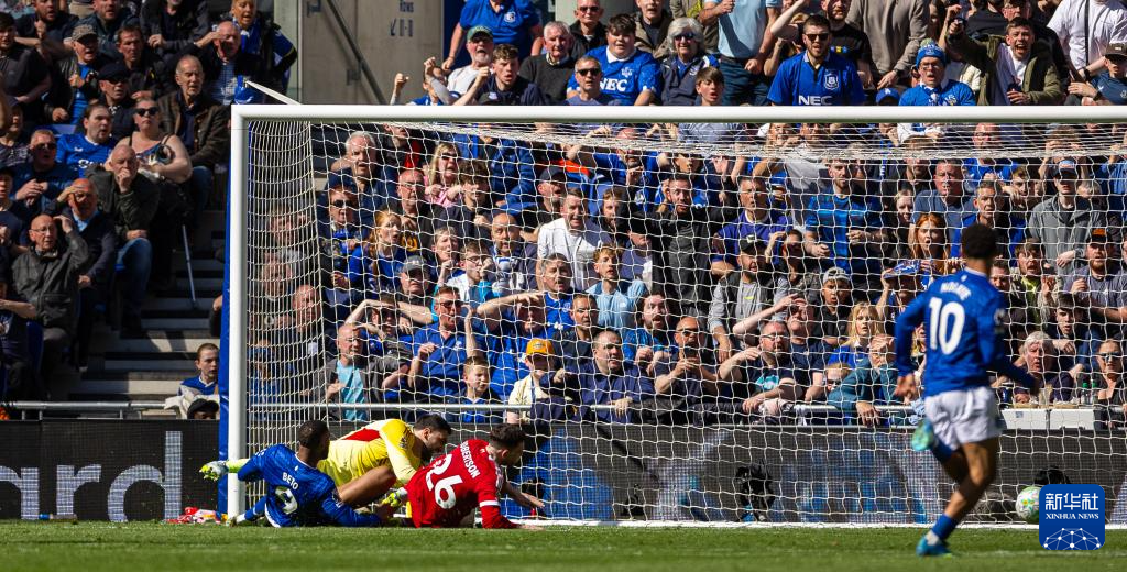 Everton's goalkeeper Jordan Pickford reacts after making a save during the English Premier League match between Everton FC and Liverpool FC in Liverpool, Britain, on April 19, 2026. (Xinhua)