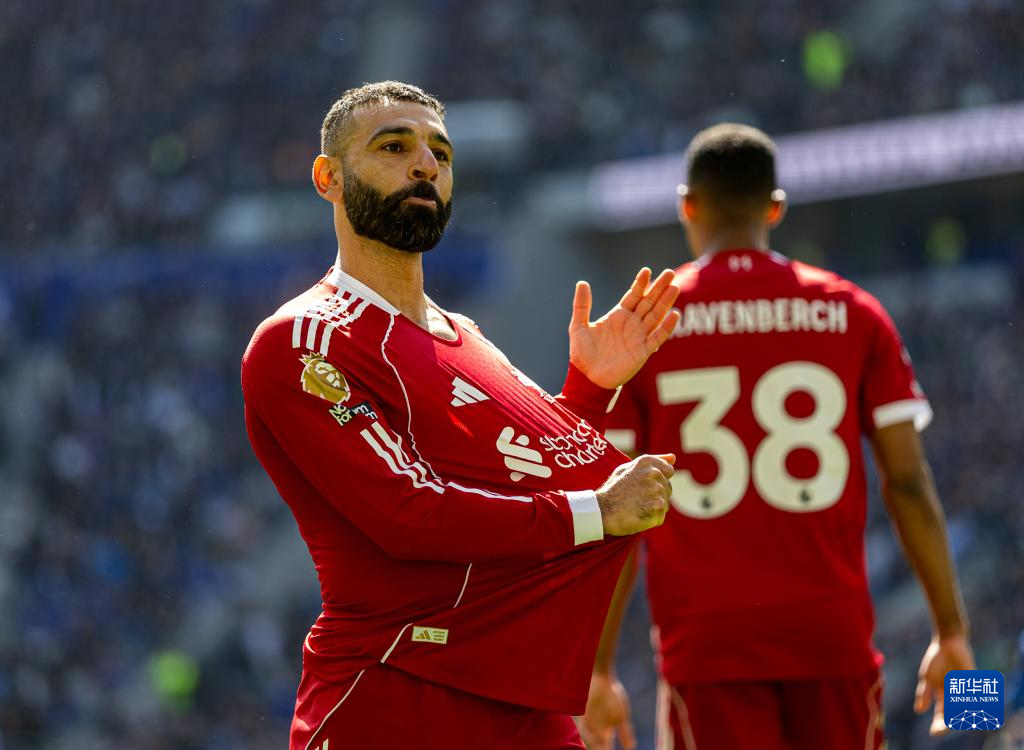 Liverpool's Mohamed Salah celebrates after scoring the first goal during the English Premier League match between Everton FC and Liverpool FC in Liverpool, Britain, on April 19, 2026. (Xinhua)