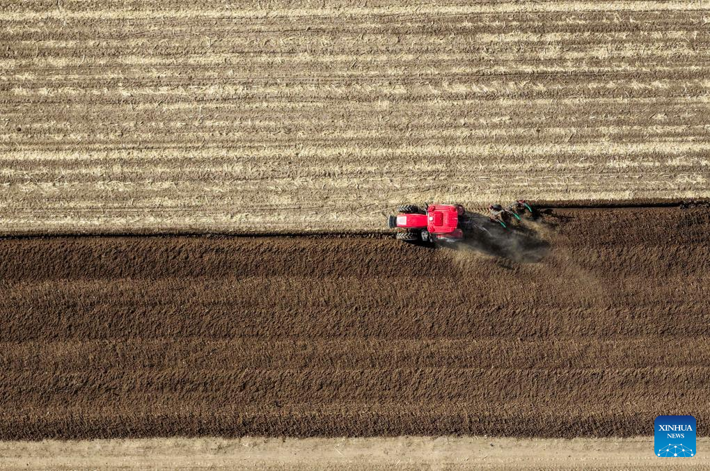 A drone photo taken on April 17, 2026 shows a farmer driving agricultural machinery to plough the fields in Horqin Left Wing Middle Banner of Tongliao City, north China's Inner Mongolia Autonomous Region. The ploughing work in Tongliao, a granary of eastern Inner Mongolia, is drawing to a close ahead of the peak period of corn sowing. It is learned that Tongliao's corn planting area in 2026 is expected to reach 20 million mu (1.33 million hectares). (Xinhua/Lian Zhen)