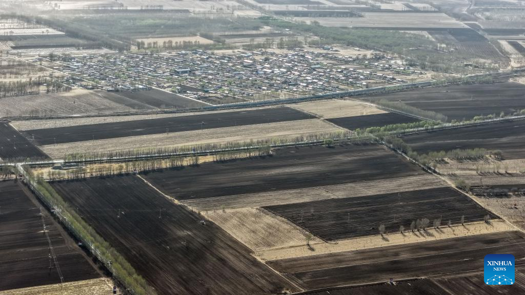 An aerial drone photo taken on April 17, 2026 shows farmland to be sown in Horqin Left Wing Middle Banner of Tongliao City, north China's Inner Mongolia Autonomous Region. The ploughing work in Tongliao, a granary of eastern Inner Mongolia, is drawing to a close ahead of the peak period of corn sowing. It is learned that Tongliao's corn planting area in 2026 is expected to reach 20 million mu (1.33 million hectares). (Xinhua/Lian Zhen)
