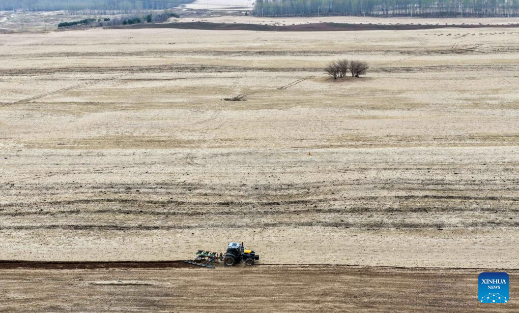 An aerial drone photo taken on April 19, 2026 shows a farmer driving agricultural machinery to plough the fields in Horqin Left Wing Rear Banner of Tongliao City, north China's Inner Mongolia Autonomous Region. The ploughing work in Tongliao, a granary of eastern Inner Mongolia, is drawing to a close ahead of the peak period of corn sowing. It is learned that Tongliao's corn planting area in 2026 is expected to reach 20 million mu (1.33 million hectares). (Xinhua/Lian Zhen)