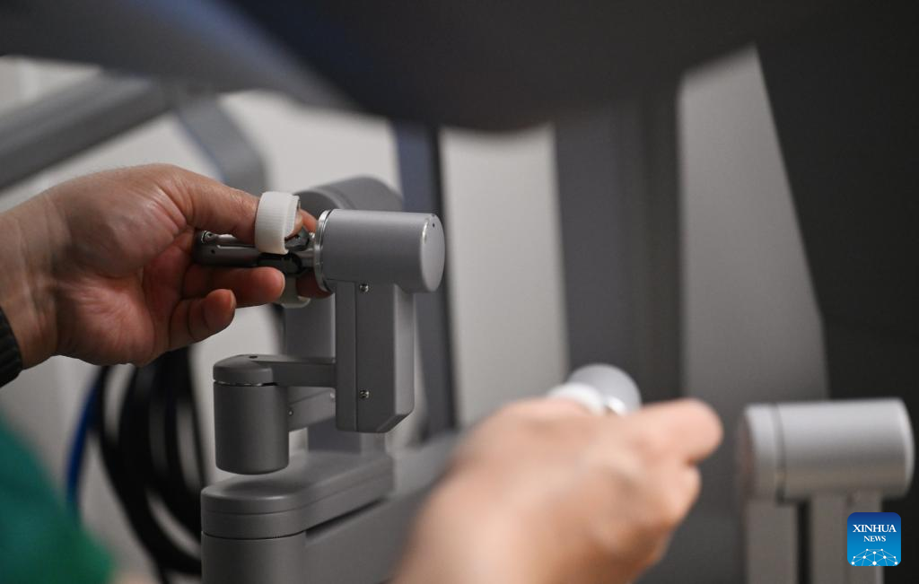 A doctor operates a da Vinci surgical robot at Tianjin Medical University Cancer Institute & Hospital in Tianjin, north China, April 19, 2026. In recent years, Tianjin Medical University Cancer Institute & Hospital has continued to advance its expertise in minimally invasive surgery. The hospital currently has three da Vinci surgical robots and has performed over 10,000 surgeries with the system, establishing a multidisciplinary minimally invasive treatment system. (Xinhua/Li Ran)