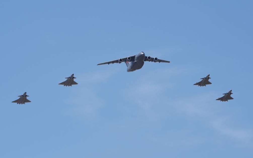 A Chinese Air Force Y-20B large transport aircraft carrying the remains of the fallen soldiers, escorted by four J-20 fighter jets, is pictured in Shenyang, northeast China's Liaoning Province, April 22, 2026. The remains of 12 Chinese People's Volunteers (CPV) martyrs who lost their lives during the War to Resist U.S. Aggression and Aid Korea (1950-1953) were returned to China from the Republic of Korea (ROK) on Wednesday.