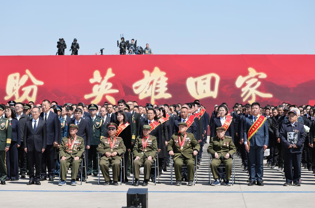 Chinese People's Volunteers (CPV) veterans and other attendees welcome the remains of the CPV martyrs at Taoxian International Airport in Shenyang, northeast China's Liaoning Province, April 22, 2026. The remains of 12 Chinese People's Volunteers (CPV) martyrs who lost their lives during the War to Resist U.S. Aggression and Aid Korea (1950-1953) were returned to China from the Republic of Korea (ROK) on Wednesday.