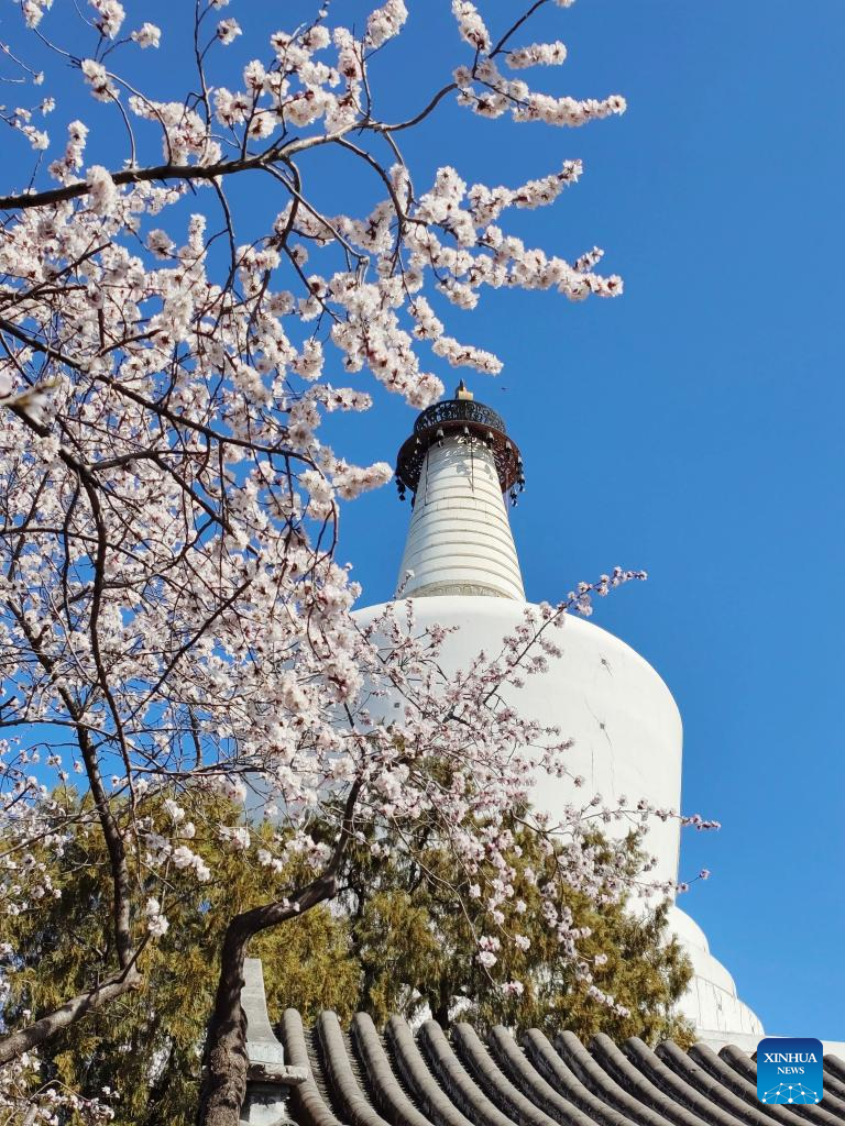 Blooming flowers are seen with the White Pagoda in the background at Beihai Park in Beijing, capital of China, March 14, 2022. (Xinhua/Xu Jinquan)