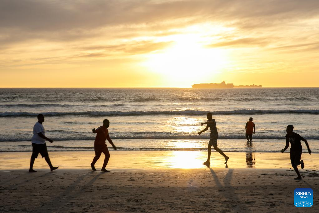 People have fun on Sunset Beach at sunset in Cape Town, South Africa, on March 26, 2022. (Xinhua/Lyu Tianran)