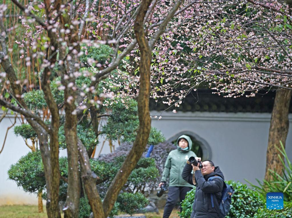 A citizen takes photos of plum blossoms in Qingxiu Mountain scenic area in Nanning, south China's Guangxi Zhuang Autonomous Region, Feb. 13, 2022. The Qingxiu Mountain scenic area has attracted many tourists as plum trees are in blossom in early spring. (Xinhua/Zhou Hua)