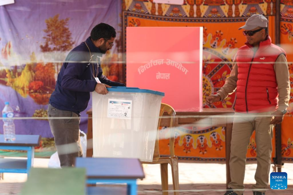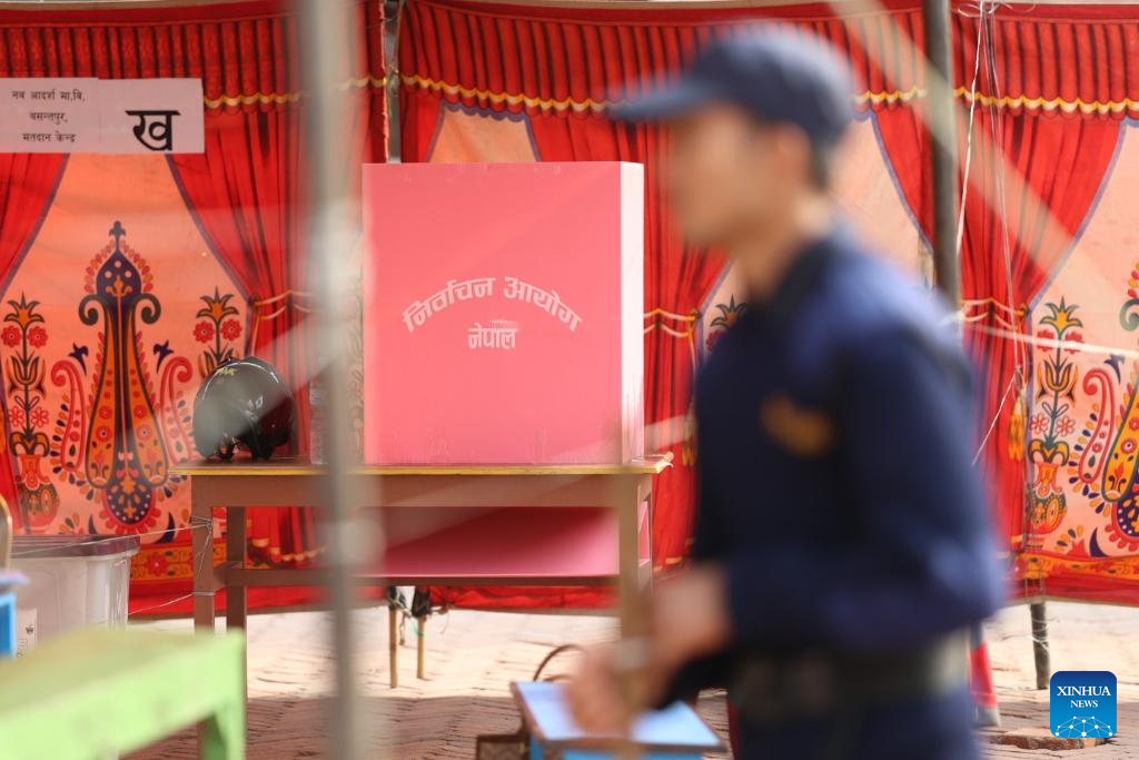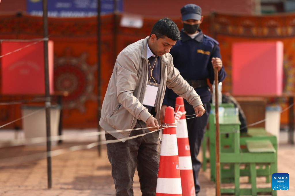 A staff member makes preparations for Nepal's upcoming parliamentary elections in Kathmandu, Nepal, March 4, 2026, Nepal's interim Prime Minister Sushila Karki on Monday urged citizens to actively participate in the parliamentary elections scheduled for March 5, calling the vote as an opportunity to shape their future and that of their children. Addressing the nation ahead of the elections, Karki said public participation is crucial to steering Nepal toward political stability and economic prosperity. (Photo by Sulav Shrestha/Xinhua)