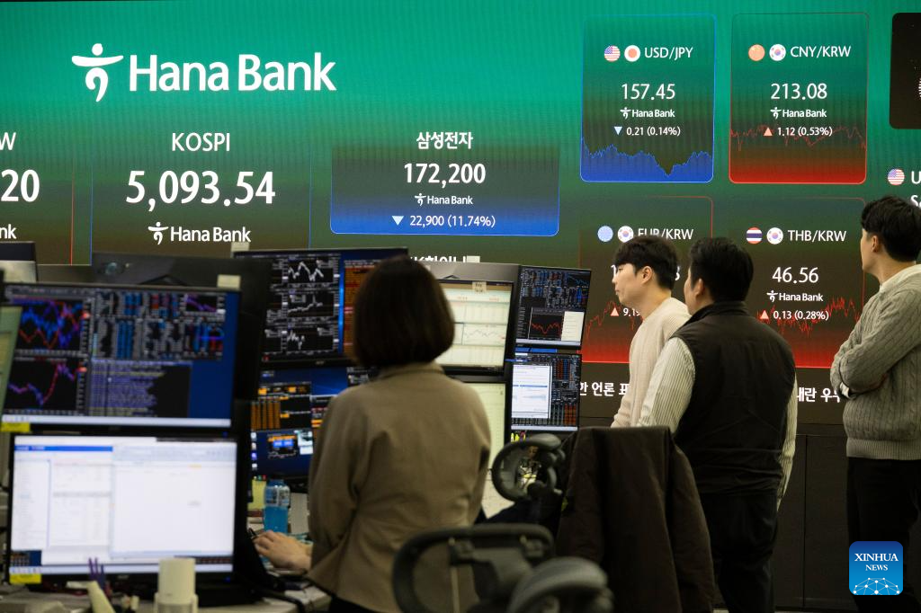 An employee works at the dealing room of Hana Bank in Seoul, South Korea, March 4, 2026. The Korea Exchange triggered circuit breakers on both the KOSPI and KOSDAQ markets following the severe market crash, caused by the escalating geopolitical tensions in the Middle East. The benchmark KOSPI dived 698.37 points, or 12.06 percent, to close at 5,093.54, and the smaller KOSDAQ plunged 159.26 points, or 14.00 percent, to finish at 978.44. Both the KOSPI and the KOSDAQ saw their steepest daily percentage drops in history. (Photo by Jun Hyosang/Xinhua)