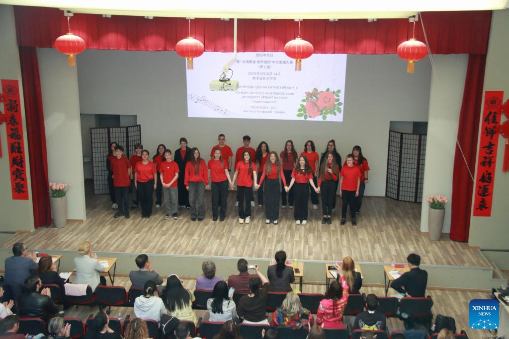 Participants perform during a Chinese singing contest in Sofia, Bulgaria, April 18, 2026. The Confucius Institute in Sofia on Saturday hosted a Chinese singing contest and inaugurated a peony culture center to celebrate this year's United Nations Chinese Language Day. (Photo by Marian Draganov/Xinhua)