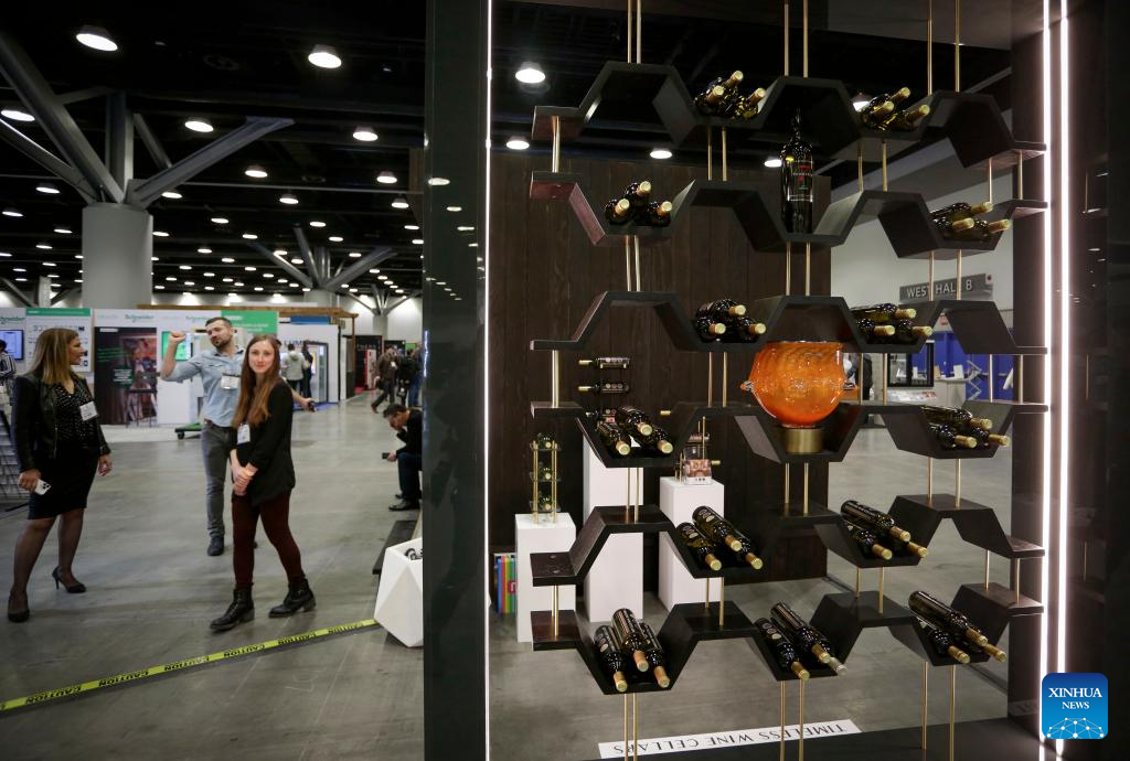 Wine cellar products are displayed during the 2022 BUILDEX show in Vancouver, British Columbia, Canada, on March 23, 2022. As one of Canada's largest conferences and trade shows for building industry, the 2022 BUILDEX Vancouver kicked off on Wednesday, showcasing the latest building materials, products and technologies. (Photo by Liang Sen/Xinhua)