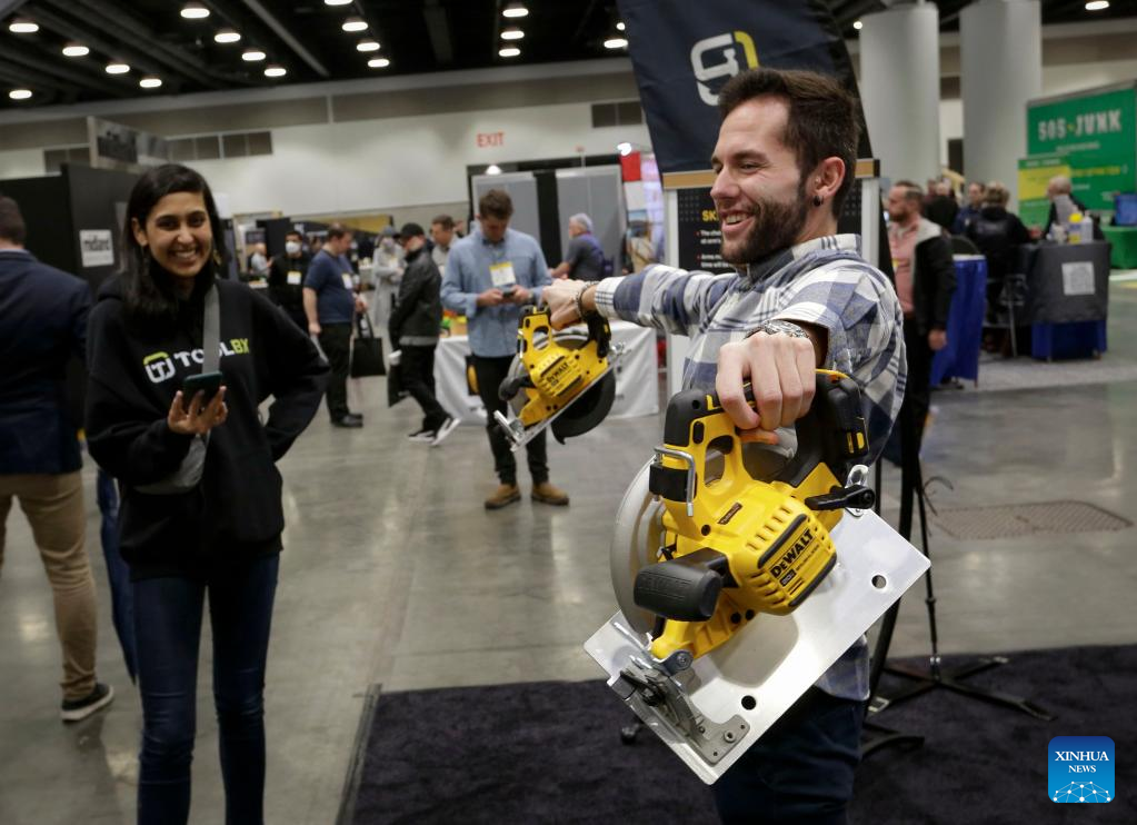 A visitor experiences light-weight construction tools during the 2022 BUILDEX show in Vancouver, British Columbia, Canada, on March 23, 2022. As one of Canada's largest conferences and trade shows for building industry, the 2022 BUILDEX Vancouver kicked off on Wednesday, showcasing the latest building materials, products and technologies. (Photo by Liang Sen/Xinhua)