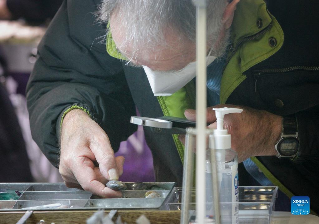 Visitors look at gemstones displayed during the Gem and Mineral Show in Vancouver, British Columbia, Canada, on March 25, 2022. The three-day show features about 100 vendors from across Canada with their gem, mineral and rare fossil collections. (Photo by Liang Sen/Xinhua)