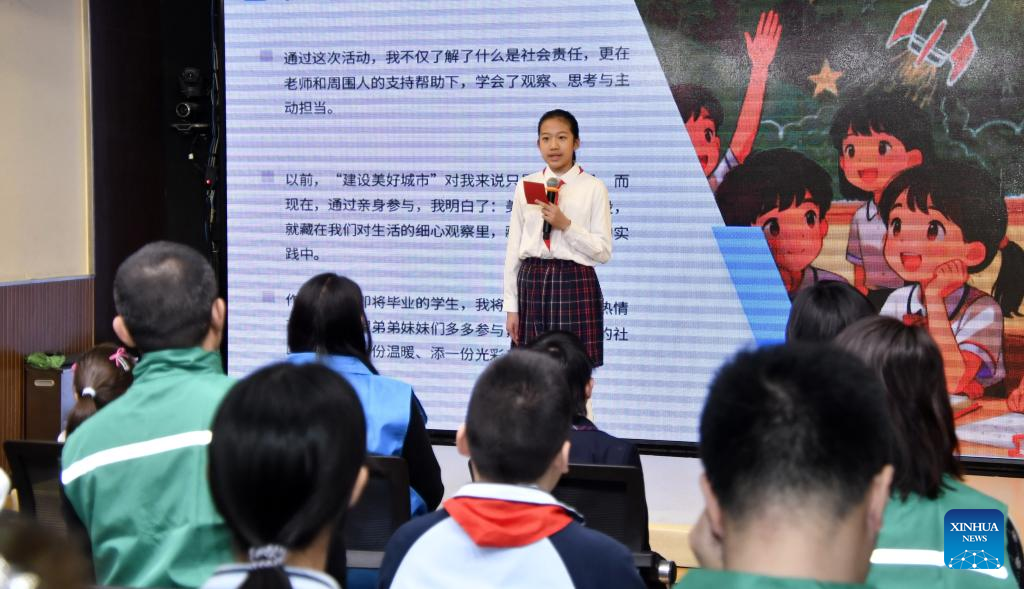 A student gives a speech during the opening ceremony of a new semester at a primary school in Dongcheng District of Beijing, March 2, 2026. A new semester kicked off for primary and secondary schools in many parts of China on Monday. (Xinhua/Li Xin)